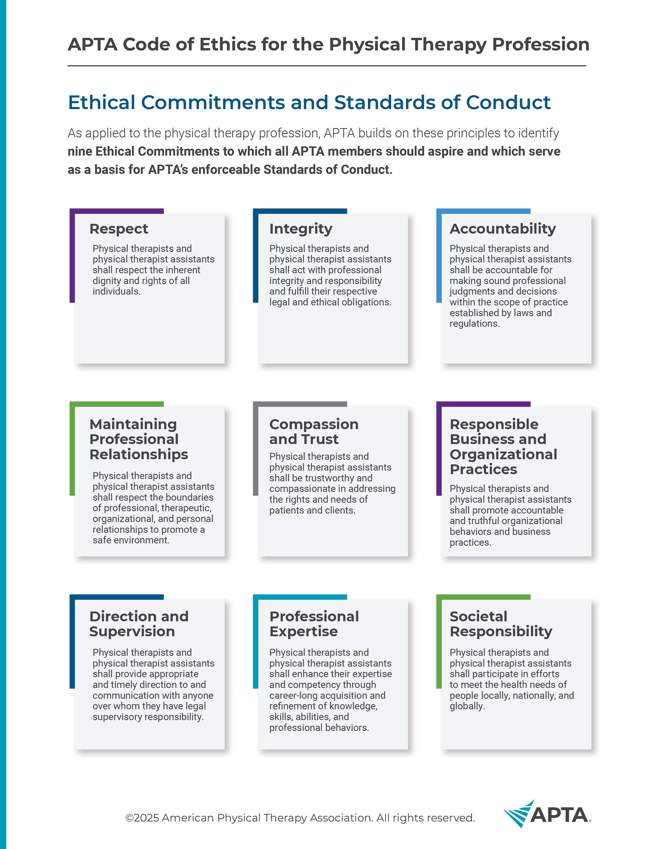 The vision of the American Physical Therapy Association is "transforming society by optimizing movement to improve the human experience." Our profession’s charge, as we strive to be an inclusive moral community that is diverse and equitable, is to meet the health needs of all people. APTA is a voluntary professional society that strives both to serve APTA members and to support the profession as a whole. Ethical conduct by physical therapists and physical therapist assistants is vital to the standing of the profession.